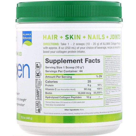 *Some information on the ALLMAX Nutrition Grass Fed & Pasture Raised Collagenlabel may be missing, or it may have been written incorrectly. We work hard to keep the information accurate & up to date. Please let us know if you discover any errors.