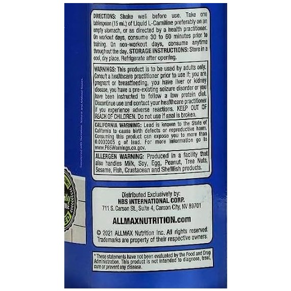 *Some information on the ALLMAX Nutrition Liquid L-Carnitine 1500label may be missing, or it may have been written incorrectly. We work hard to keep the information accurate & up to date. Please let us know if you discover any errors.