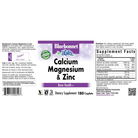 *Some information on the Bluebonnet Nutrition Calcium Magnesium Plus Zinclabel may be missing, or it may have been written incorrectly. We work hard to keep the information accurate & up to date. Please let us know if you discover any errors.