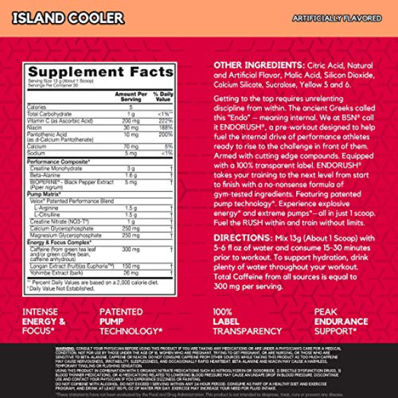 *Some information on the BSN Endorush Pre-Workoutlabel may be missing, or it may have been written incorrectly. We work hard to keep the information accurate & up to date. Please let us know if you discover any errors.