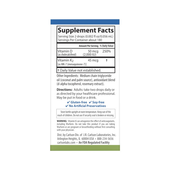 *Some information on the Carlson Labs Liquid Vitamins Super Daily D3+K2label may be missing, or it may have been written incorrectly. We work hard to keep the information accurate & up to date. Please let us know if you discover any errors.