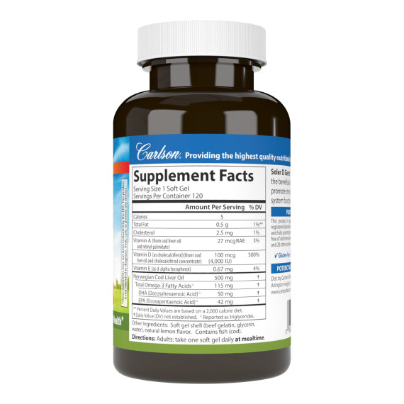 *Some information on the Carlson Labs Solar D Gems Vitamin D3 Omega-3slabel may be missing, or it may have been written incorrectly. We work hard to keep the information accurate & up to date. Please let us know if you discover any errors.