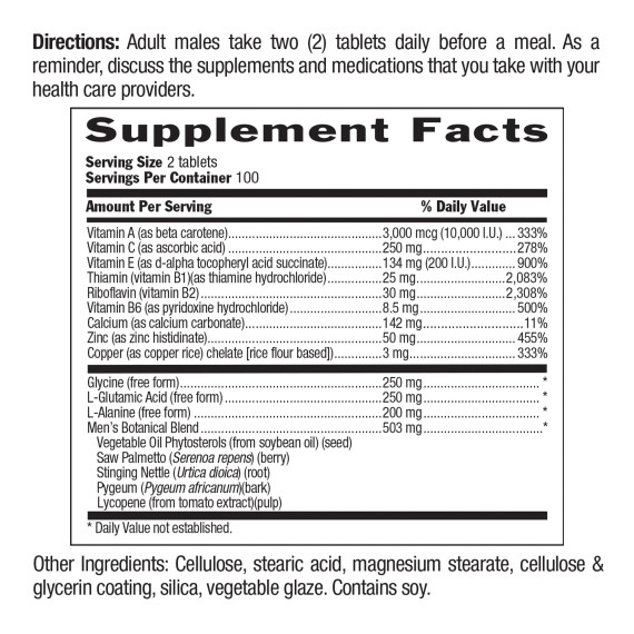 | Saw Palmetto | 100 mg (Serenoa repens) (Berry) | 320 mg (fruit) [std. to 85% total fatty acids] | missing substance or information* | 320 mg (Serenoa repens ) (85-95% Fatty Acids and Sterols) |