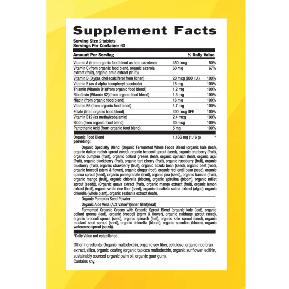 | Vitamin B2 | 2.1 mg (Vitamin B2 from Organic Food Blend) | 50 mg (vitamin B2) (as riboflavin, riboflavin 5'-phosphate) | 50 mg (vitamin B2) (as riboflavin, riboflavin 5'-phosphate) | missing substance or information* |