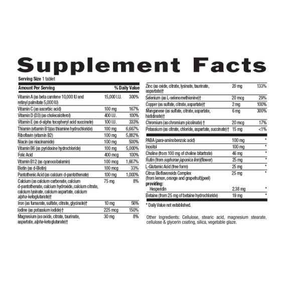 | Calcium | 75 mg (as calcium carbonate, calcium d-pantothenate, calcium hydroxide, calcium citrate, calcium lysinate, calcium aspartate, calcium alpha-ketoglutarate)† | missing substance or information* | missing substance or information* | missing substance or information* |
