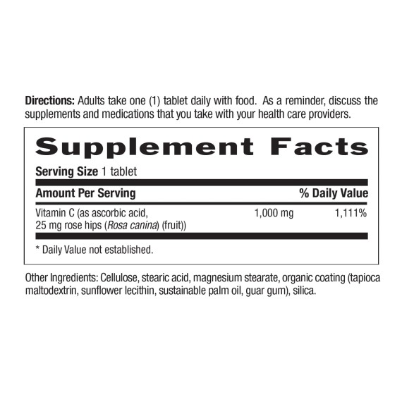 | Vitamin C | 1,000 mg (as ascorbic acid, rose hips) | 1000 mg (as Ascorbic Acid) | 1000 mg (as Q-C ascorbic acid) | 500 mg (as Ascorbic Acid) |