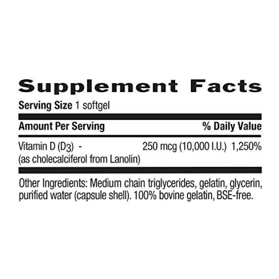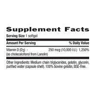 | Vitamin D | 10,000 I.U. (D³) (as cholecalciferol from Lanolin) | 1000 IU (as cholecalciferol/D3) | 2000 IU (as cholecalciferol/D3) | 1000 IU (as cholecalciferol/D3) |