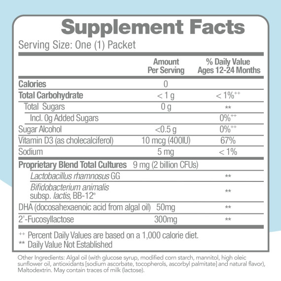 *Some information on the Culturelle Probiotics Baby Grow+Thrive Probiotics+Vitamin D Packets 12-24 Monthslabel may be missing, or it may have been written incorrectly. We work hard to keep the information accurate & up to date. Please let us know if you discover any errors.