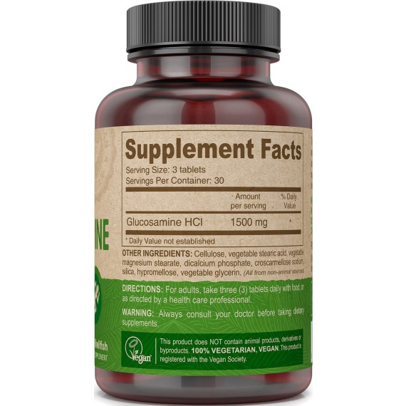 | Glucosamine | 1500 mg | 1500 mg (as Hydrochloride) | 1000 mg (from crustacean shellfish) | 1500 mg Hydrochloride (vegetarian, shellfish-free) |