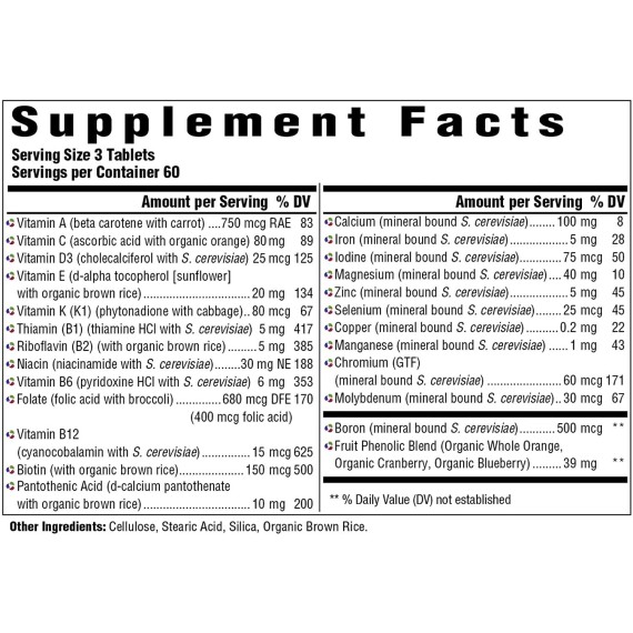 | Iodine | 75 mcg (mineral bound S. cerevisiae) | 150 mcg (as potassium iodide) | 150 mcg (as potassium iodide) | missing substance or information* |