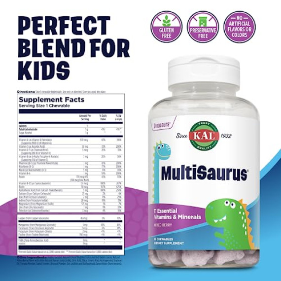*Some information on the KAL Dinosaurs MultiSaurus Vitamins & Minerals Mixed-Berrylabel may be missing, or it may have been written incorrectly. We work hard to keep the information accurate & up to date. Please let us know if you discover any errors.