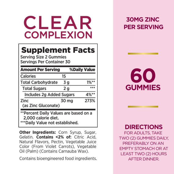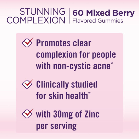 *Some information on the Nature's Bounty Stunning Complexion Gummieslabel may be missing, or it may have been written incorrectly. We work hard to keep the information accurate & up to date. Please let us know if you discover any errors.