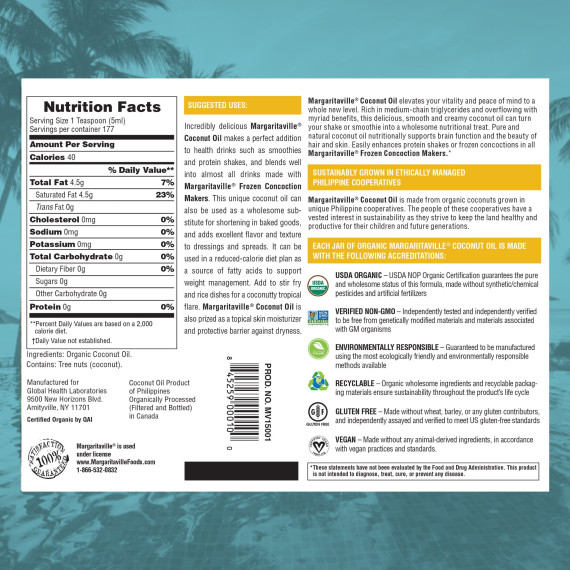 *Some information on the Nature's Plus Margaritaville Life Coconut Oillabel may be missing, or it may have been written incorrectly. We work hard to keep the information accurate & up to date. Please let us know if you discover any errors.