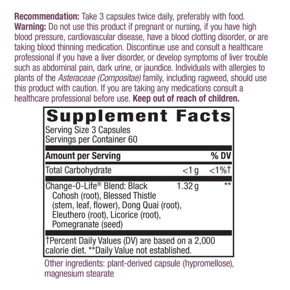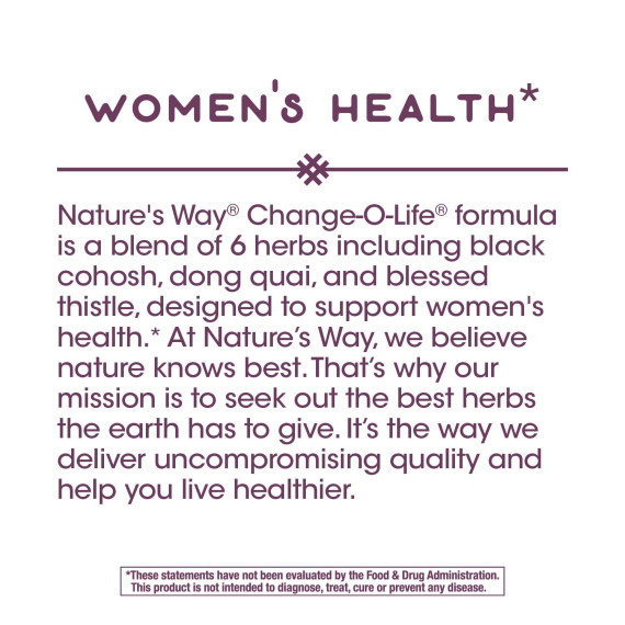 *Some information on the Nature's Way Change-O-Life Women's Healthlabel may be missing, or it may have been written incorrectly. We work hard to keep the information accurate & up to date. Please let us know if you discover any errors.