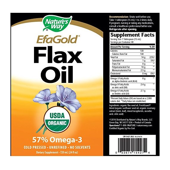 *Some information on the Nature's Way EFAGold Organic Flax Oillabel may be missing, or it may have been written incorrectly. We work hard to keep the information accurate & up to date. Please let us know if you discover any errors.