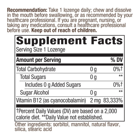 *Some information on the Nature's Way Vitamin B-12 Lozengeslabel may be missing, or it may have been written incorrectly. We work hard to keep the information accurate & up to date. Please let us know if you discover any errors.