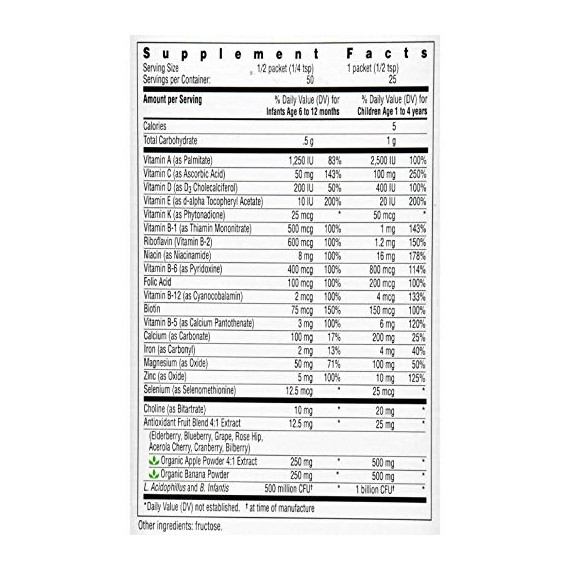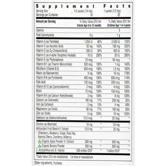 | Serving Size | 1/2 packet (1/4 tsp) | Six Capsules | 2 Gummies for Child 2-3 Years of Age 4 Gummies for Children 4 Years and Older | 1 Tablet |