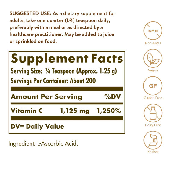 *Some information on the Solgar Pure 100% Vitamin C Crystalslabel may be missing, or it may have been written incorrectly. We work hard to keep the information accurate & up to date. Please let us know if you discover any errors.