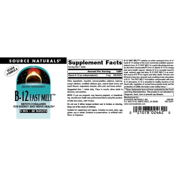 *Some information on the Source Naturals B-12 Fast Meltlabel may be missing, or it may have been written incorrectly. We work hard to keep the information accurate & up to date. Please let us know if you discover any errors.